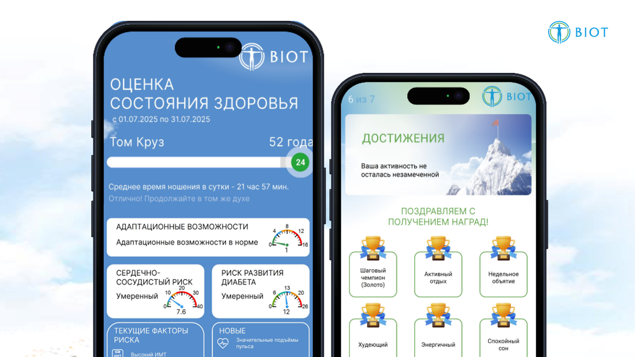 В отчеты включена динамика ключевых показателей здоровья (гидратация, сон, стресс, частота сердечных сокращений), активности, питания и данные о достижениях за выбранные периоды. Система выявляет скрытые тренды и потенциальные зоны риска, позволяя принимать более обоснованные решения в отношении состояния здоровья. Информация также отражена в отчетах.